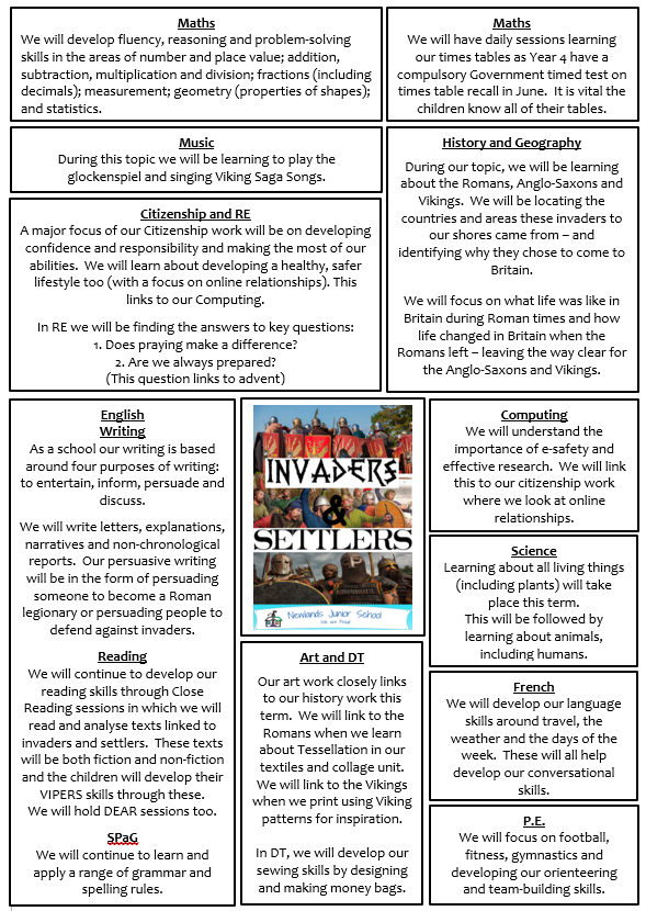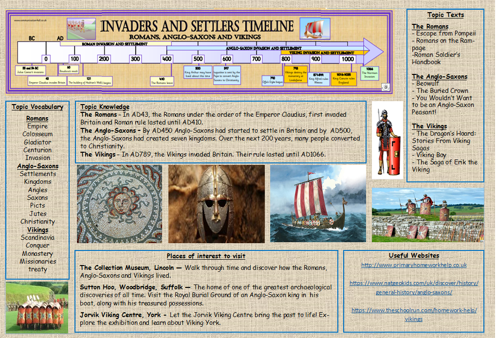 We love learning about the Invaders and settlers in Year 4! We begin our topic by learning all about the Romans before moving on to learn about the Vikings and Anglo-Saxons. We will be looking at whom these groups of people were and where they came from, as well as their everyday lives. In a few weeks we will be visiting The Collection Museum in Lincoln to round up the Roman part of our topic which we are really looking forward to. If you want to find out more about what we cover, please look at our topic overview and knowledge organiser below. As the topic progresses, we will be adding more to our class page.